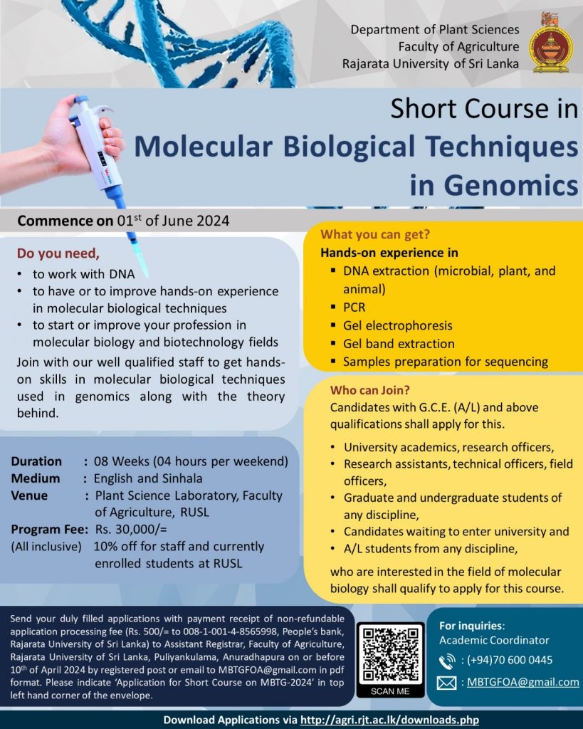 Call for Applications – Short Course in Molecular Biological Techniques in Genomics March 17, 2025 | No Comments Categories: Notice