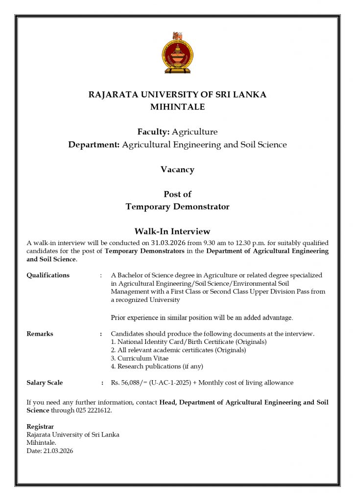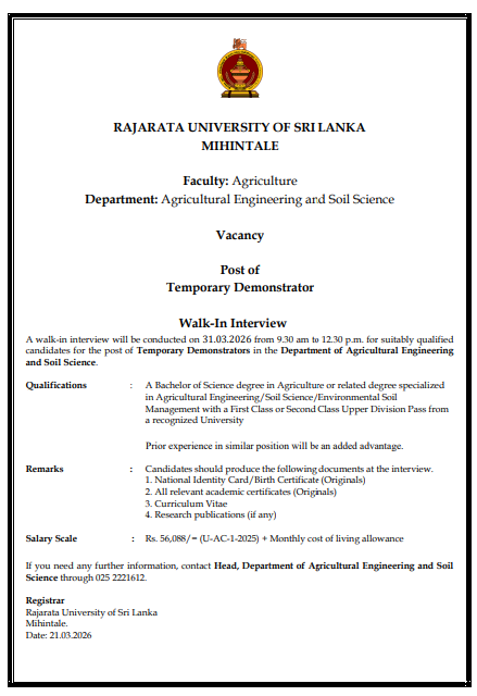 Post of Temporary Demonstrator – Department of Agricultural Engineering and Soil Science