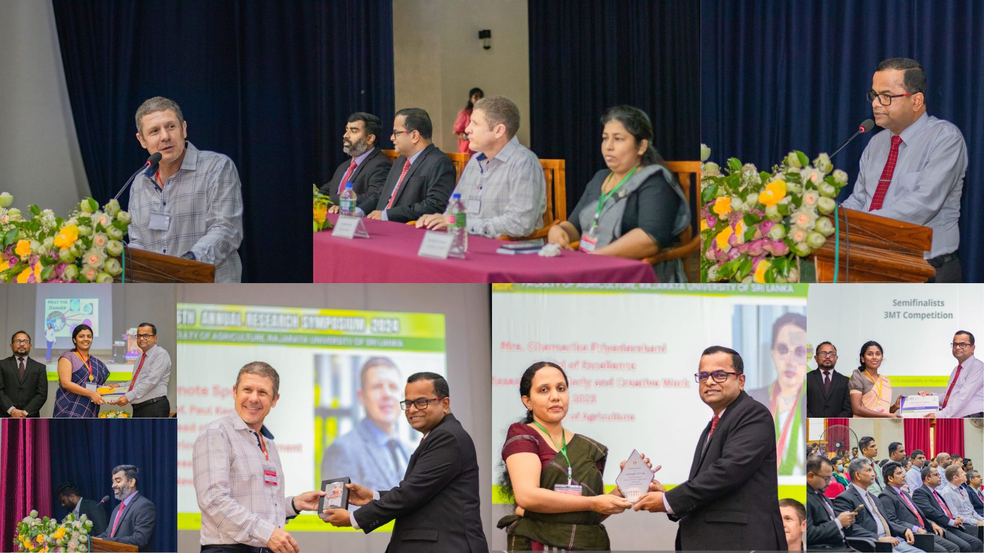 The inaugural session was commended for the tradition of lighting the oil lamp followed by reciting the university anthem. The welcome address was delivered by Dr. U.G.A.I. Sirisena as the coordinator of the symposium. Ms T.M.C.S. Siyambalangamuwa, a student of the passing out 2018/2019 batch shared her experience gained during research. This was followed by speeches from Prof. Weerasooriya, Acting VC/the Dean, FoA. The inaugural session was made splendid by the video presentation screened in which the highlights of student research were available. The video presentation was followed by the launching of the symposium proceedings, symbolised by the handing over the CD containing the abstracts of student research to the Acting Vice Chancellor by Dr. D.A.U.D. Devasinghe, the Editor-in-Chief of the symposium. Following this, the award for Excellence in Research, Scholarly, and Creative Work in 2023 was presented to Mrs. T.D.C. Priyadarshani, who excelled in her work; the award contained a plaque and certificate. Then, Prof. Paul Kenyon, Head of School, School of Agriculture & Environment/Professor in Sheep Husbandry, Massey University, delivered a thought-provoking keynote address on “Has sheep research involving farmers in New Zealand had an impact on the industry,” highlighting the importance of farmer-driven research to uplift the agriculture-based industries. Mrs. M.A.A.P. Kumari delivered the vote of thanks.