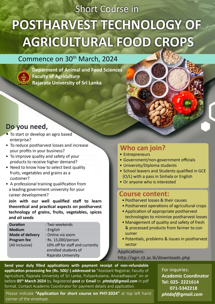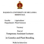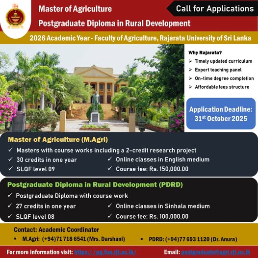 Notices Admission of Diploma Holders in Agriculture to Bachelor of Science Honours in Agriculture Degree Programme(2023/2024 Batch) April 24, 2025 Read More Call for applications – 2022/2023 Needy Scholarship April 24, 2025 Read More Success Awaits at…. Postgraduate Programmes 2025 Intakes April 23, 2025 Read More Post of Assistant Registrar (Contract Basis)/Post of Assistant Bursar (Contract Basis) April 23, 2025 Read More Short Course in Food Processing Technology April 23, 2025 Read More Walk in Interview – Graduate Programme Assistant April 16, 2025 Read More MInVolume III Issue II of Mindspark English e-MagazineMIn April 1, 2025 Read More 140 වැනි කන්නන්ගර ජන්ම දිනය සමරමින් පාසල් හා විශ්වවිද්යාල මට්ටමින් පවත්වන තරගාවලිය March 31, 2025 Read More Post of Temporary Assistant Lecturer in Genetics and Plant Breeding March 30, 2025 Read More Post of Temporary Demonstrator – Agricultural Systems March 29, 2025 Read More Provincial Level Invention Evaluation for “Sahasak Nimavum 2024” National Invention Exhibition and Competition March 28, 2025 Read More Revised orientation program and mentors list -2022/2023 Batch March 27, 2025 Read More 12 12